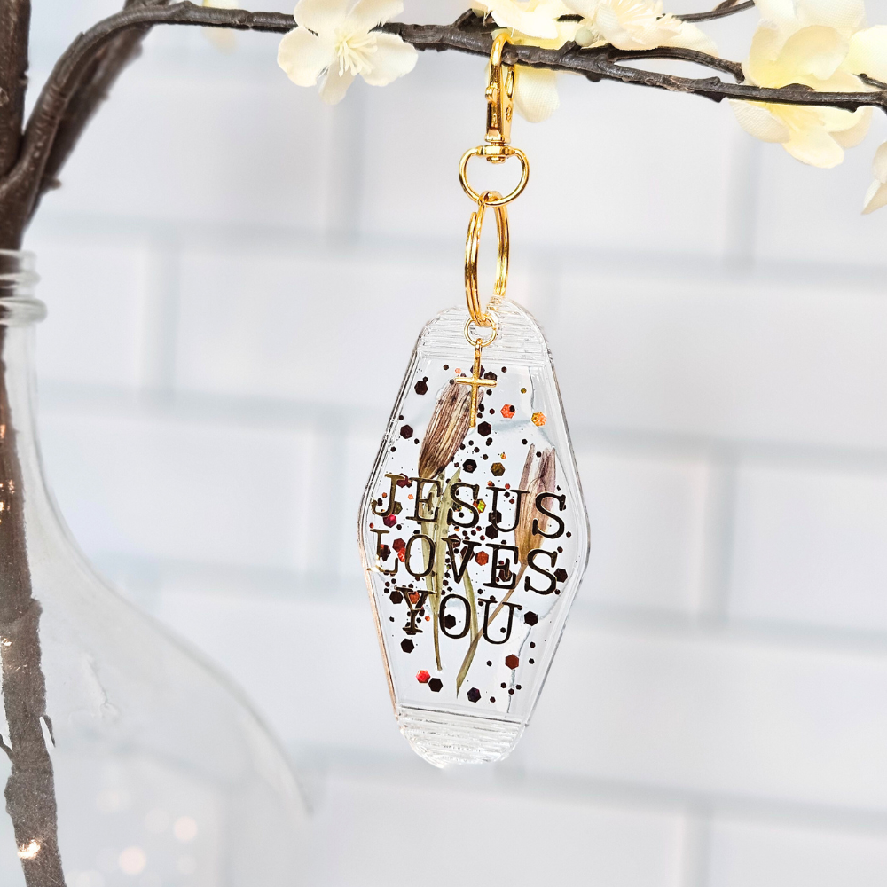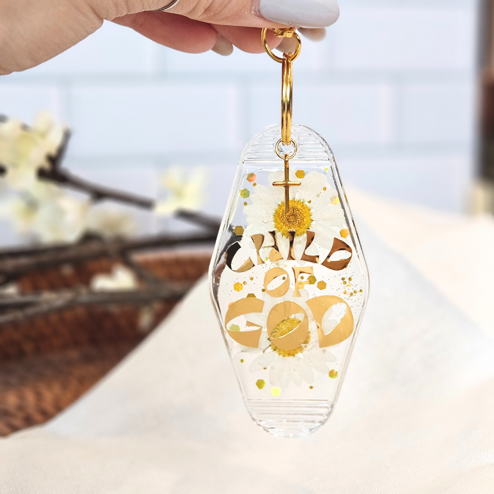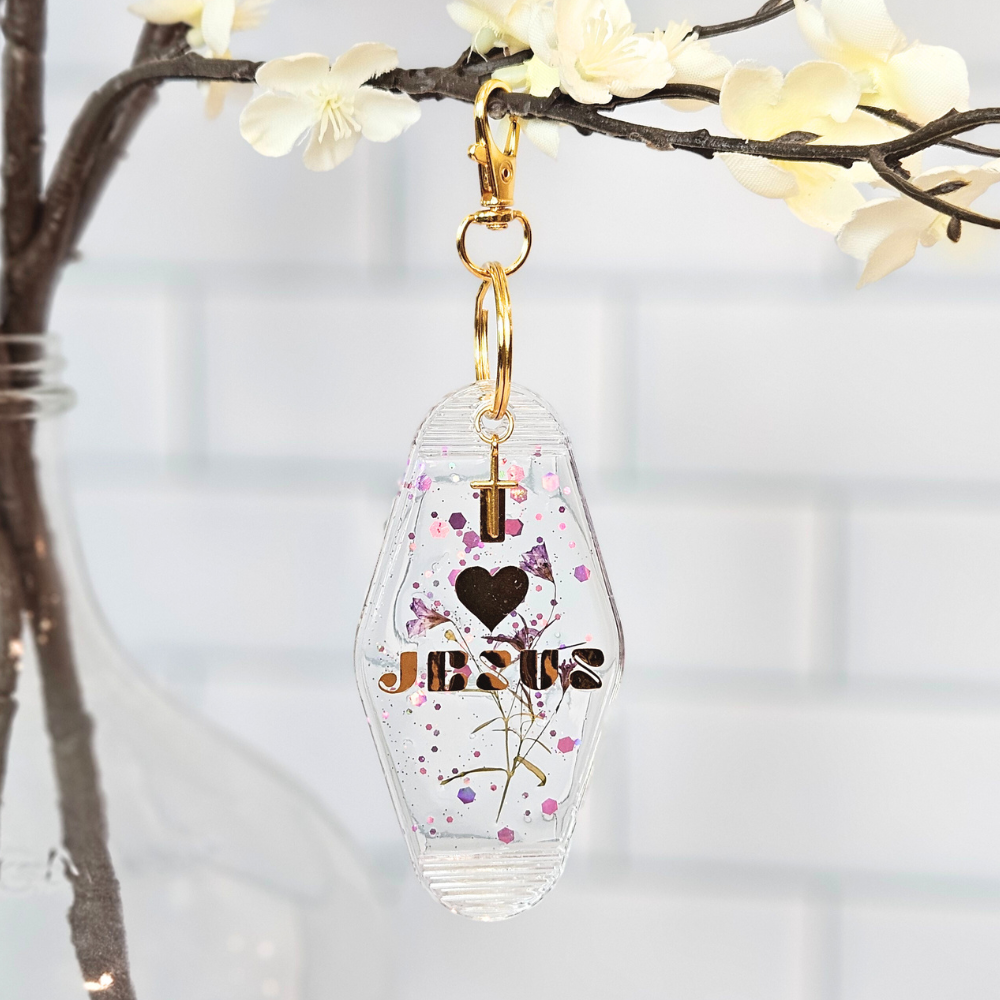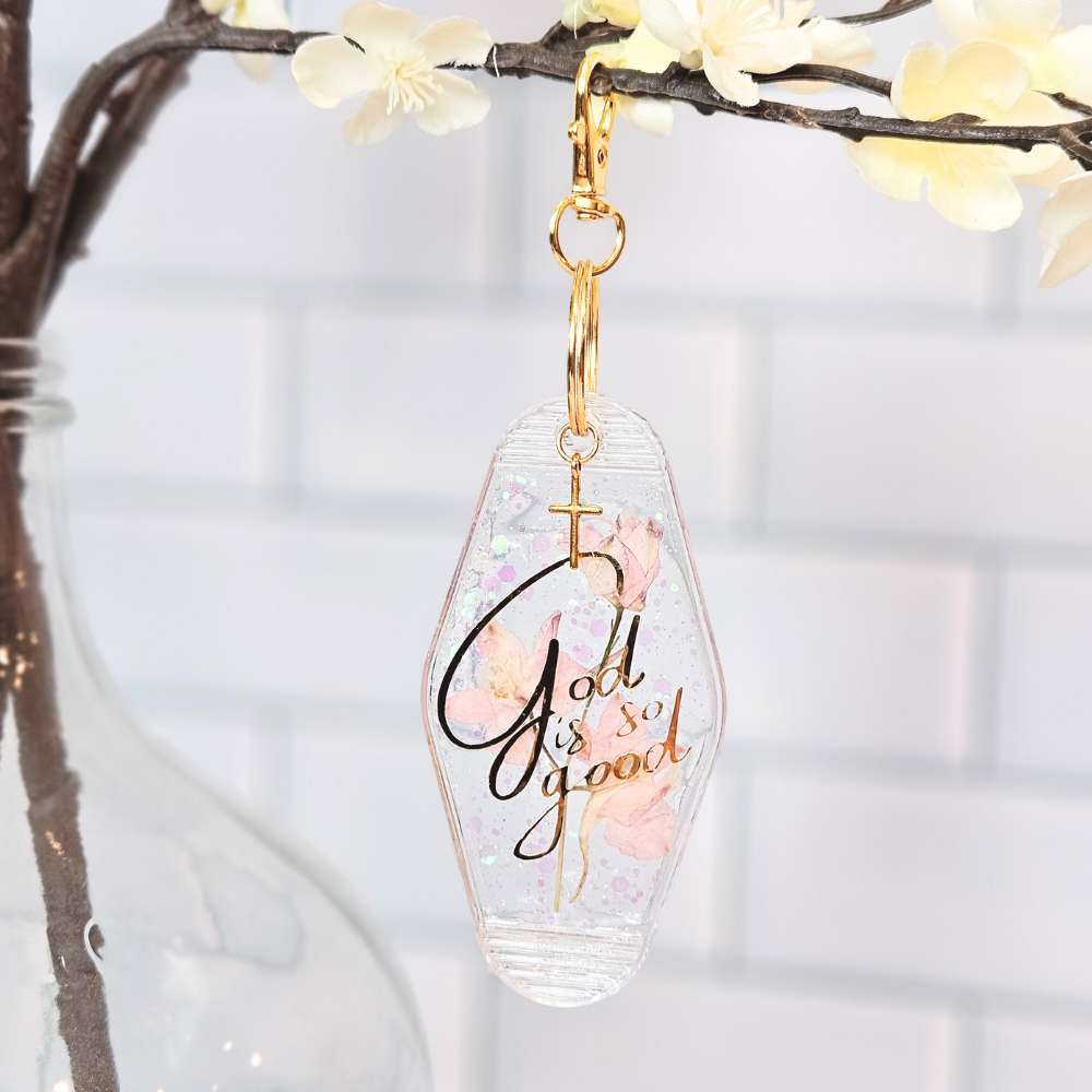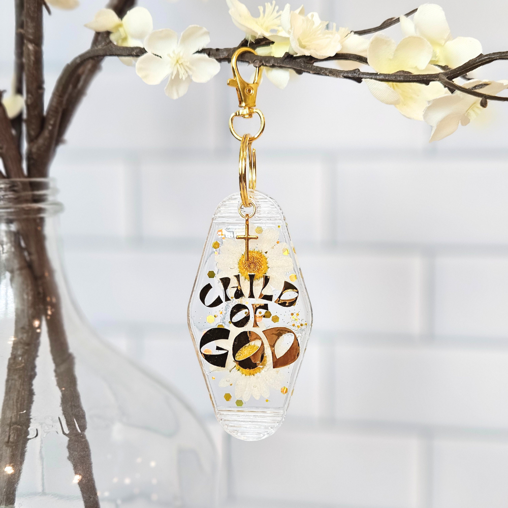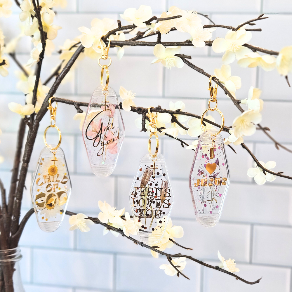 Vintage-Inspired Pressed Flower Motel Keychain | Glitter & Gold Foil Design | Handcrafted for God’s Glory