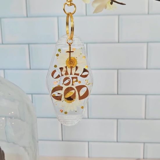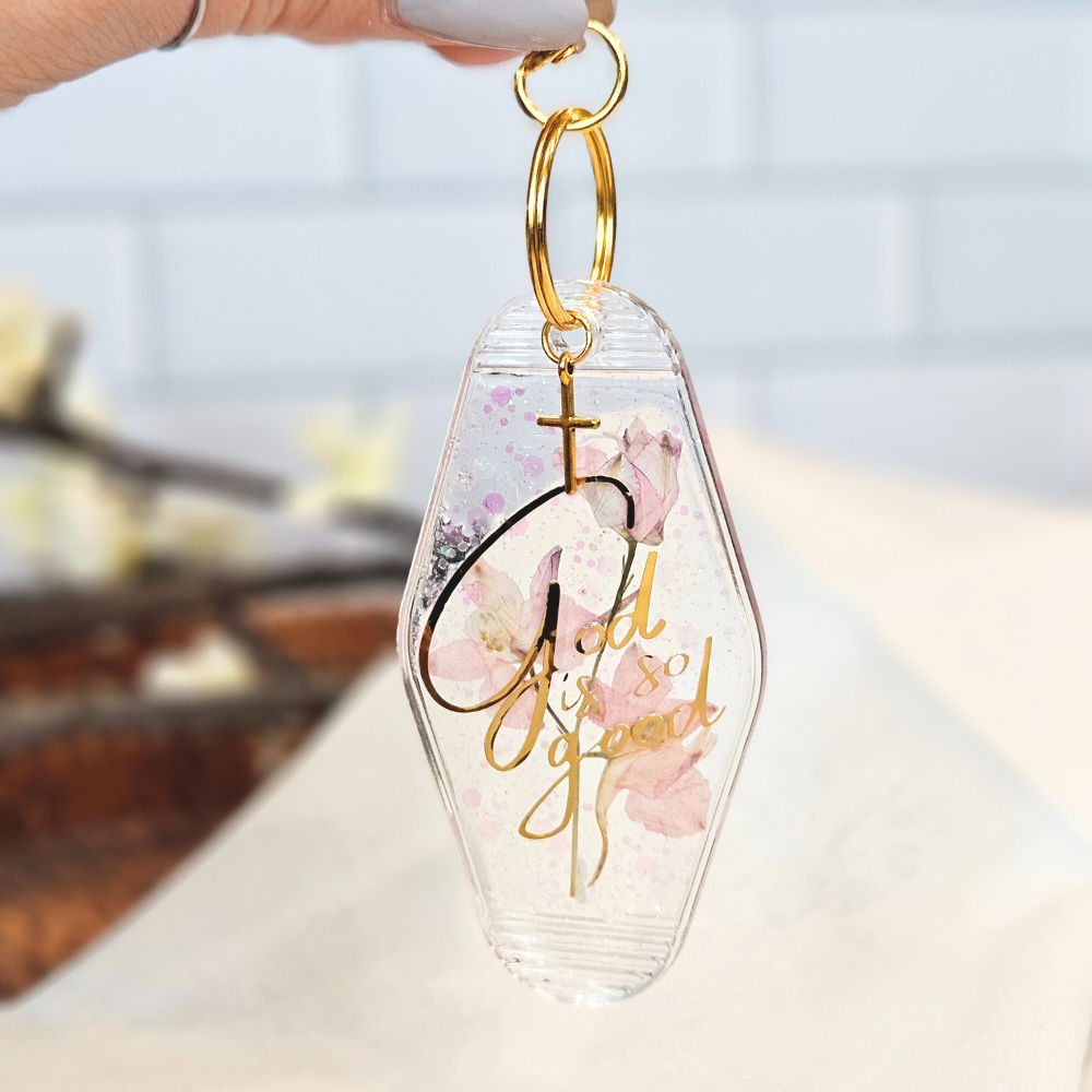 Bring a touch of nostalgic charm and divine beauty wherever you go with this handcrafted vintage-inspired motel keychain, thoughtfully designed with real pressed flowers, shimmering glitter accents, and elegant gold foil letter detailing.